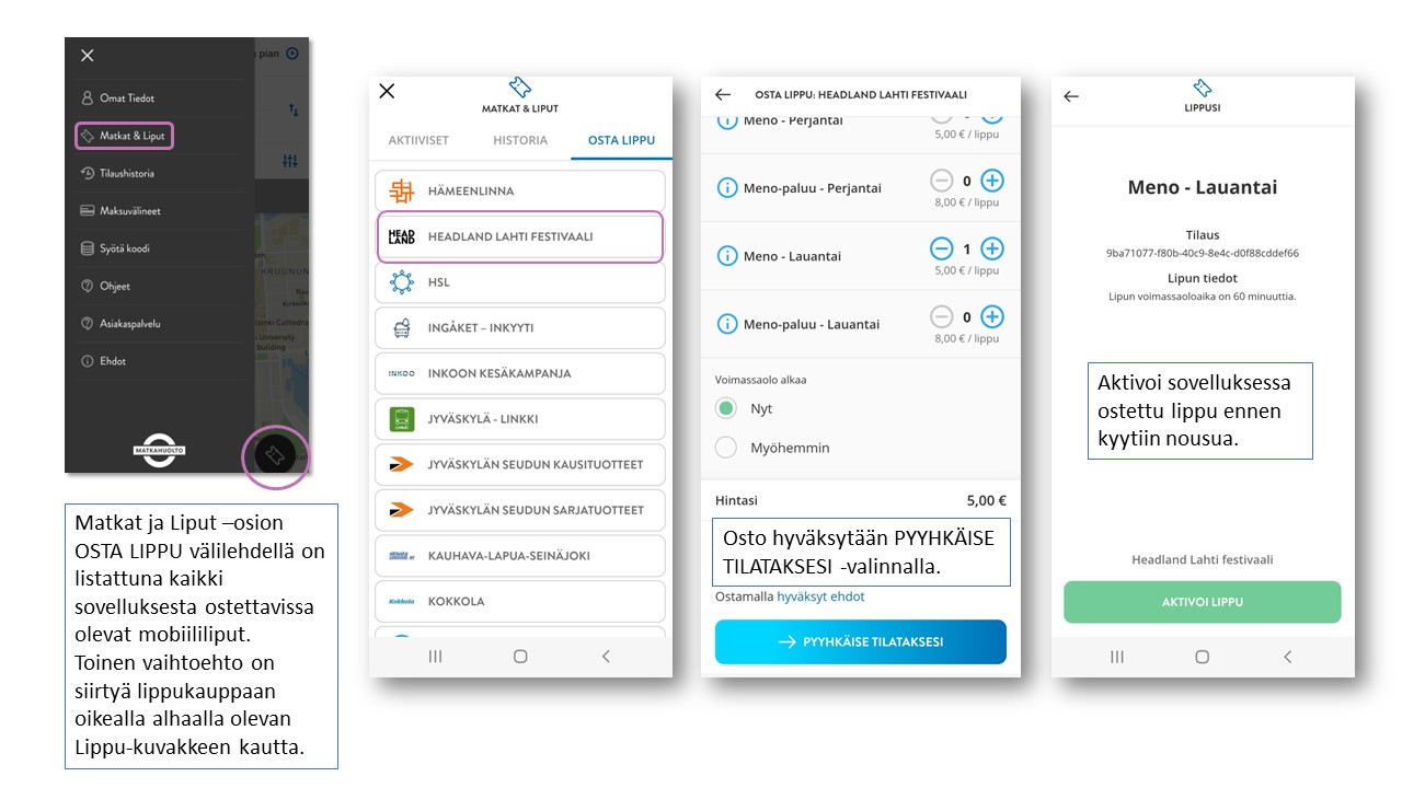 Liput ostat kätevästi Matkahuollon Reitit & liput -mobiilisovelluksella. Sovelluksen avulla voit ostaa lippusi koko reitille esimerkiksi Helsinki-Lahti-Headland.